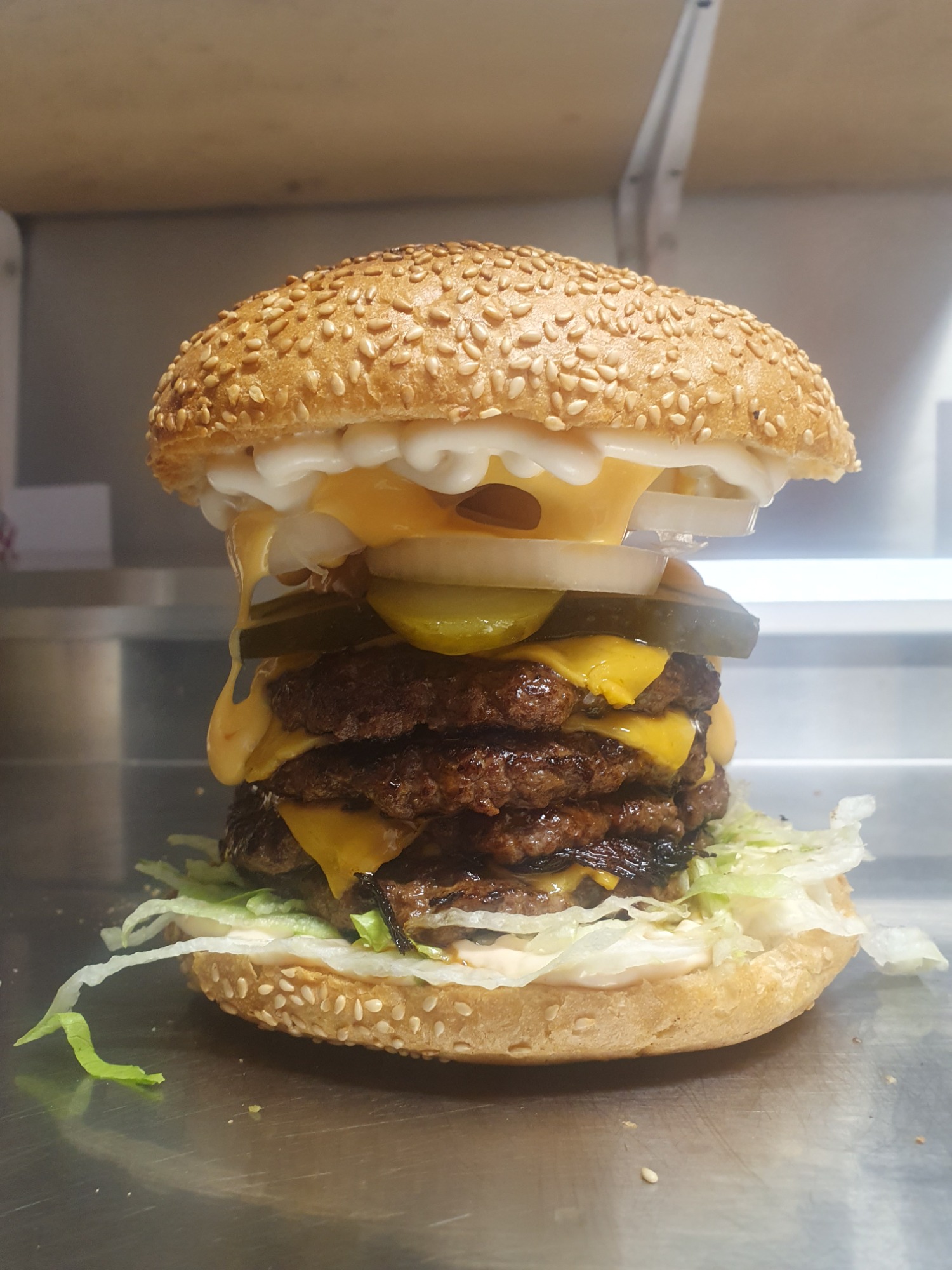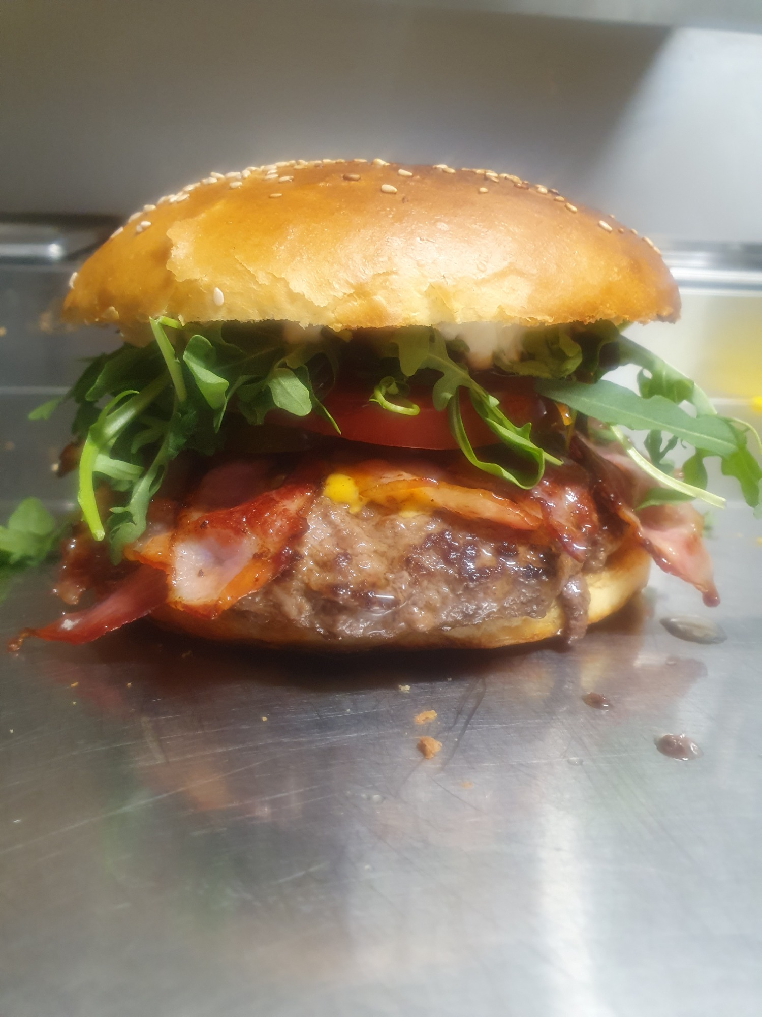 wołowina 270g, sałata, pomidor, baza czosnkowa, ser cheddar, cebula, ogórek, bekon, jajko, sos musztardowy, ketchup -